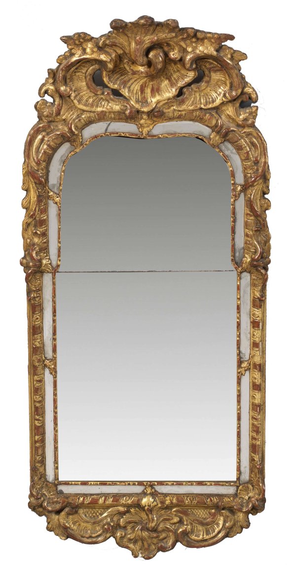 Kleiner Barock-Spiegel Holz, geschnitzt, gefasst und vergoldet. Hochrechteckige, profilierte Spiegelrahmung mit reliefiertem Blattwerk sowie passig geschweiftem oberen Abschluss. Durchbrochen gearbeitete, vorkragende Bekrönung aus üppigem Muschelwerk sowie unterer Abschluss aus Blattvoluten. Zweigeteiltes, altes Spiegelglas. 85 cm x 37 cm.