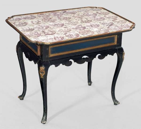 Barock-Teetisch Holz, schwarz und blau gefasst sowie teilw. vergoldet. Gerader, einschübiger Zargenkasten mit profilierten Füllungen sowie bombiertem und ornamental ausgesägtem unteren Abschluss auf geschwungenen Beinen. Weit überstehende, umlaufend profilierte Deckplatte, flächendeckend belegt mit teilw. rest. Bibelfliesen in manganviolett. H. 75,5 cm. 96 cm x 70 cm.