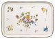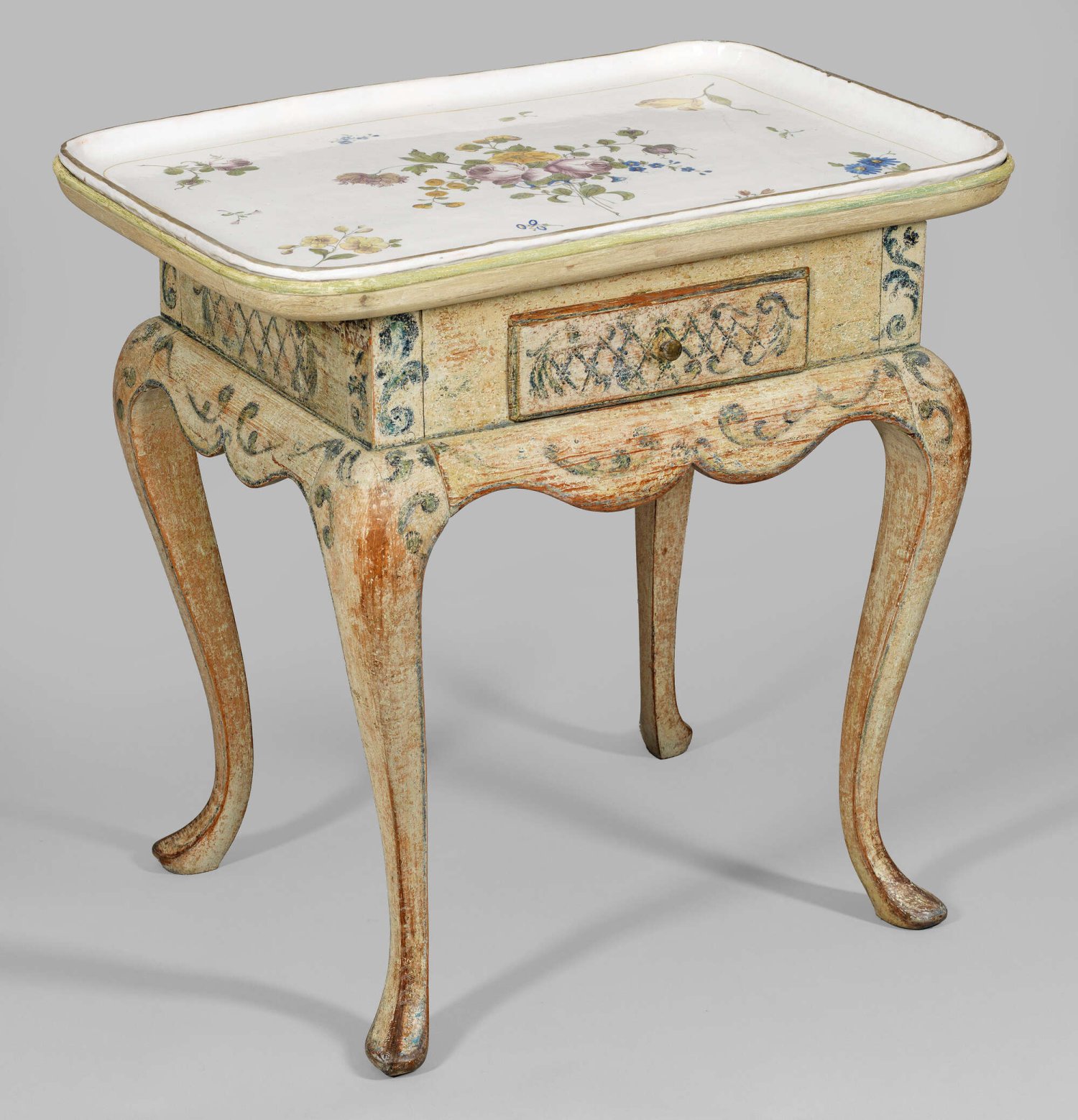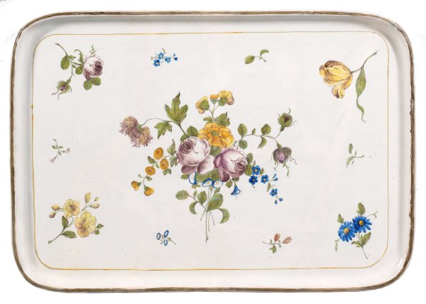 Prächtiger Rokoko-Teetisch mit Fayenceplatte Fayence mit polychromer Scharffeuermalerei sowie Holz, elfenbeinfarben gefasst und teilw. blau-grau bemalt. Gerader, einschübiger Zargenkasten, seitlich mit kleinen ausziehbaren Abstellflächen sowie unterhalb passig geschweiftem Gestell mit stark geschwungenen Beinen. Dekor aus großzügig angelegten Volutenmotiven. Gering überstehende, eingelassene rechteckige, gemuldete Deckplatte mit gerundeten Ecken, rest.; In der Mitte großes Blütengebinde aus Rosen und Vergissmeinnicht von entsprechenden, lose gestreuten Blüten umgeben. H. 78 cm. 79 cm x 55 cm.