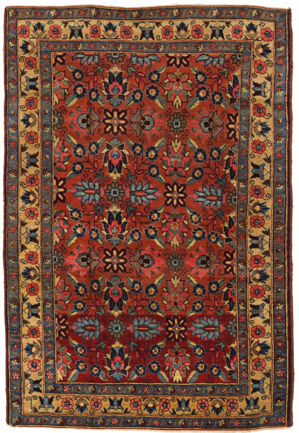 Antike Sarough-Brücke Persien. Anfang 20. Jh.; Wolle auf Baumwolle. Im roten Innenfeld flächendeckende Musterung aus Palmettenblüten im Rapport. Umlaufend goldgelbe Bordüre aus Blütenranken, flankiert von schmalen Nebenbordüren. 190 cm x 124 cm.