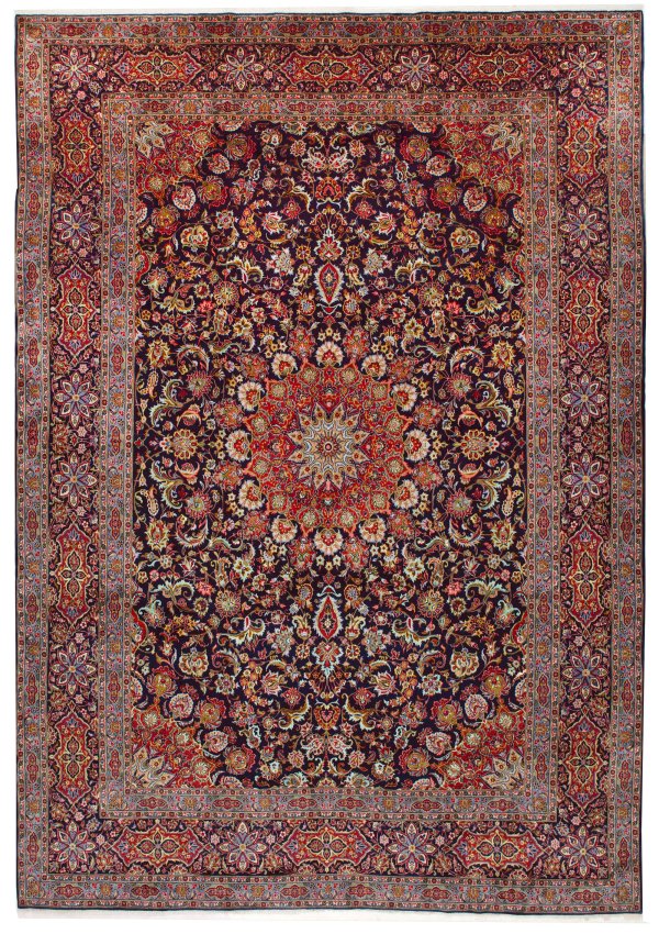 Großer signierter Keschan-Teppich Persien. Wolle auf Baumwolle. Im dunkelblauen Innenfeld zentrales Rundmedaillon und geschweifte Ecklösungen mit Palmettenanhängern. Flächendeckende Musterung aus dichten Blattranken. Umlaufend breite, rotgrundige Bordüre mit Reserven, flankiert von schmalen Nebenbordüren. Sign.; 420 cm x 304 cm.