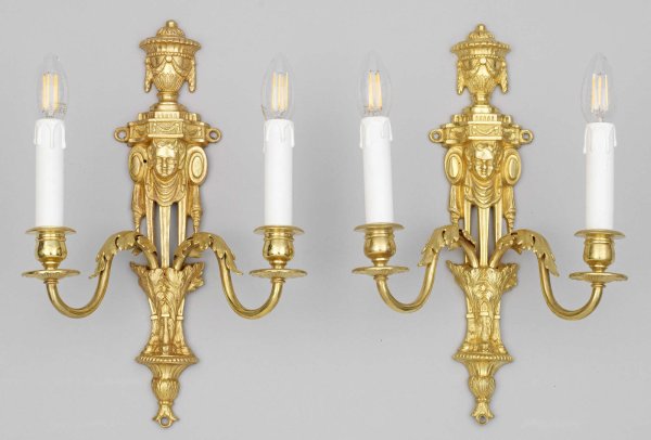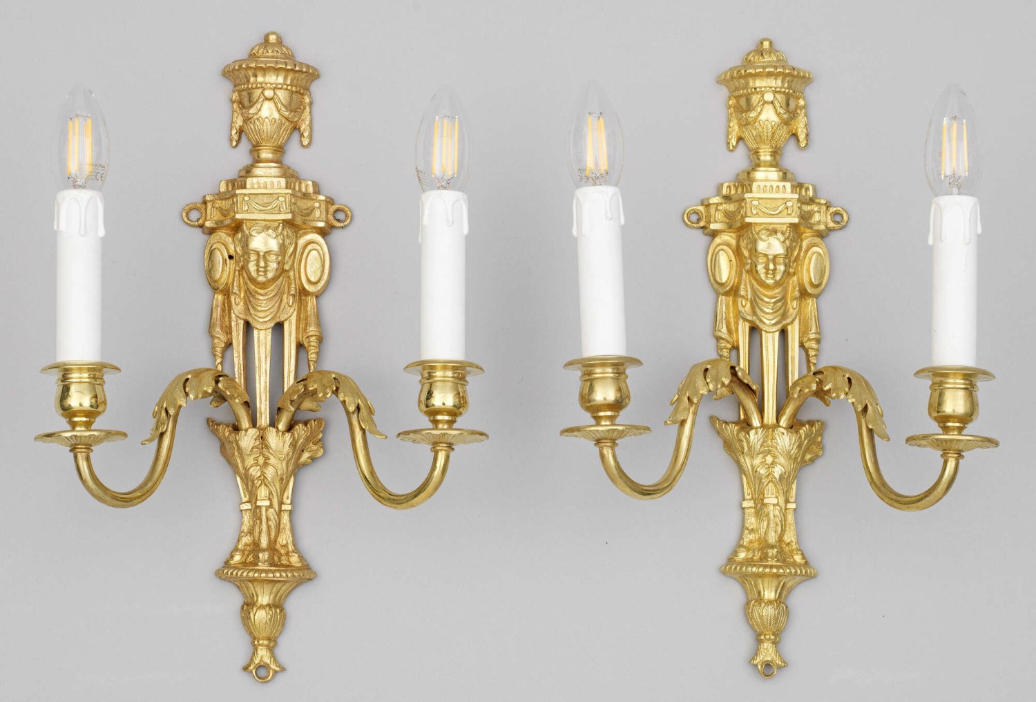 Paar Wandappliken im Louis XVI-Stil 2-flg.; Bronze, vergoldet und Messing. Durchbrochen gearbeitetes Wandschild mit Maskaron und Vasenbekrönung. Davon ausgehend stark geschwungene Leuchterarme mit vasenförmigen Tüllen. Rest. mit Erg.; Elektrifiziert. H. 41 cm.