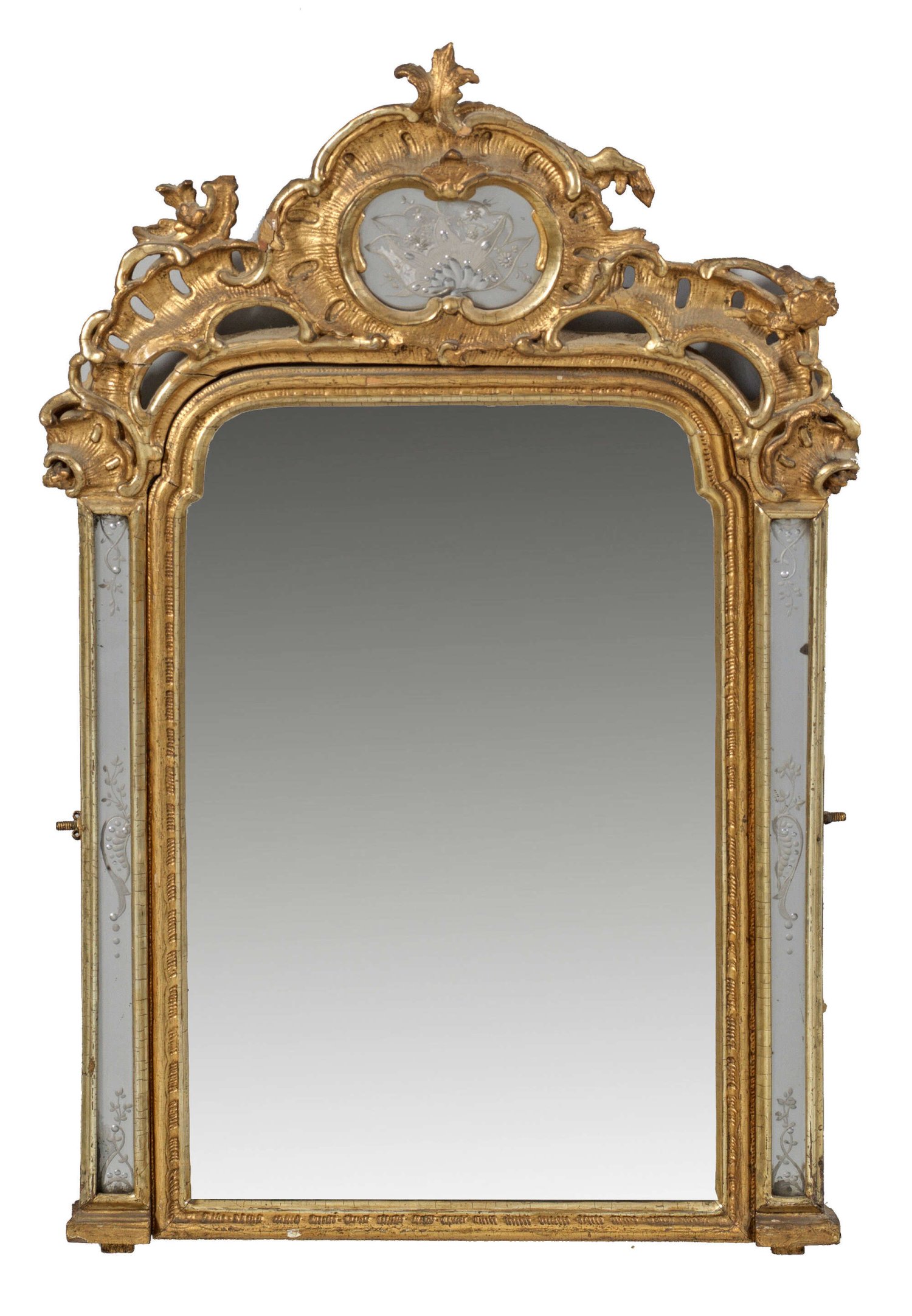 Kleiner Barock-Wandspiegel Holz, geschnitzt, gefasst und vergoldet sowie teilw. floral geätztes Spiegelglas. Hochrechteckige Spiegelrahmung aus schmalen, profilierten Streben. Geschweift ansteigender, durchbrochen gearbeiteter oberer Abschluss aus üppigen Rocaillen. 71 cm x 48 cm.