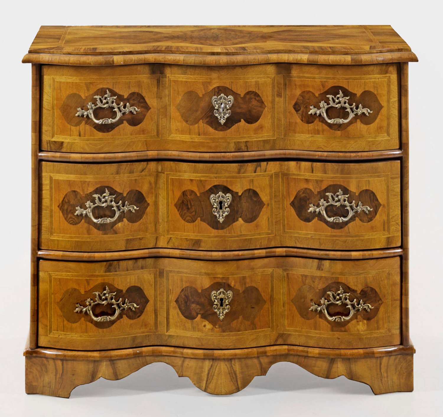 Barock-Kommode Nussbaum, furniert. Gerader Korpus auf ausgebogtem, gesägtem Zargensockel. In der gegliederten Front drei breite, mehrfach gegenläufig geschweifte Schubladen. Gering überstehende, profilierte Deckplatte. Flächendeckend breit gerahmte Furnierfelder, schauseitig aus großen, kontrastierenden Reserven, von Bandeinlagen begrenzt. H. 81 cm. 96,5 cm x 53 cm.