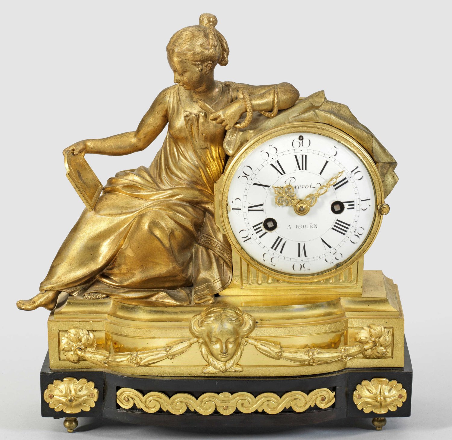 Louis XVI-Pendule Bronze, vergoldet sowie ebonisiertes Holz. Vollplastische Darstellung einer jungen Dame mit Schlange, auf das runde Uhrengehäuse gelehnt. Unterhalb gestuft ansteigender Sockel mit zentralem Maskaron. Verglastes Emailzifferblatt bez. Prevot à Rouen. Pendulenwerk mit Pendelfeder sowie Halbstundenschlag auf Glocke. H. 33 cm. 29 cm x 11 cm.