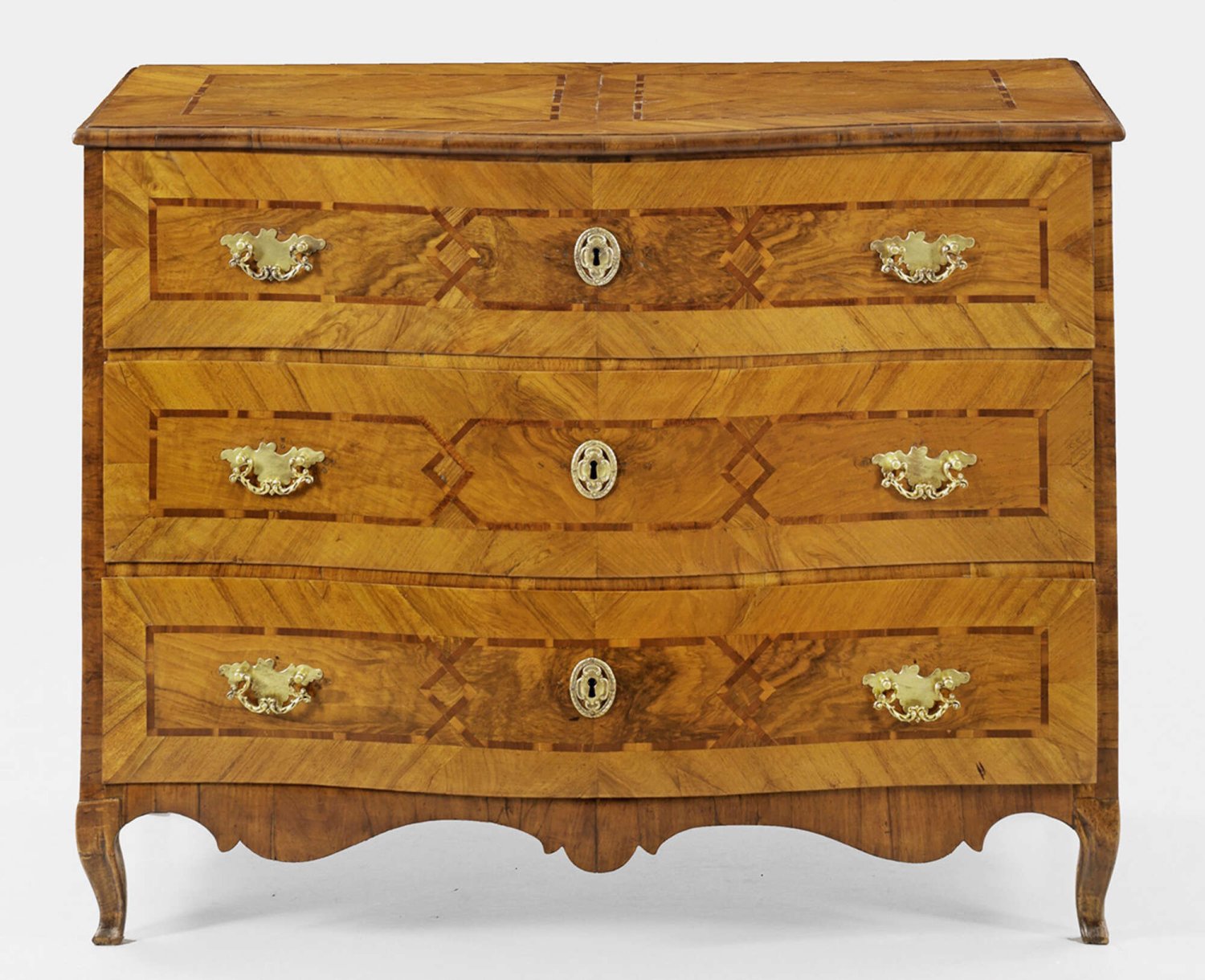Große Barock-Kommode Nussbaum, furniert sowie Einlagen aus Pflaumenholz. Gerader Korpus auf schmaler Profilzarge und geschweiften Füßen. In der gegliederten Front drei breite, bombierte Schubladen. Gering überstehende, profilierte Deckplatte. Flächendeckend breit gerahmte Furnierfelder. H. 91 cm. 119 cm x 65 cm.