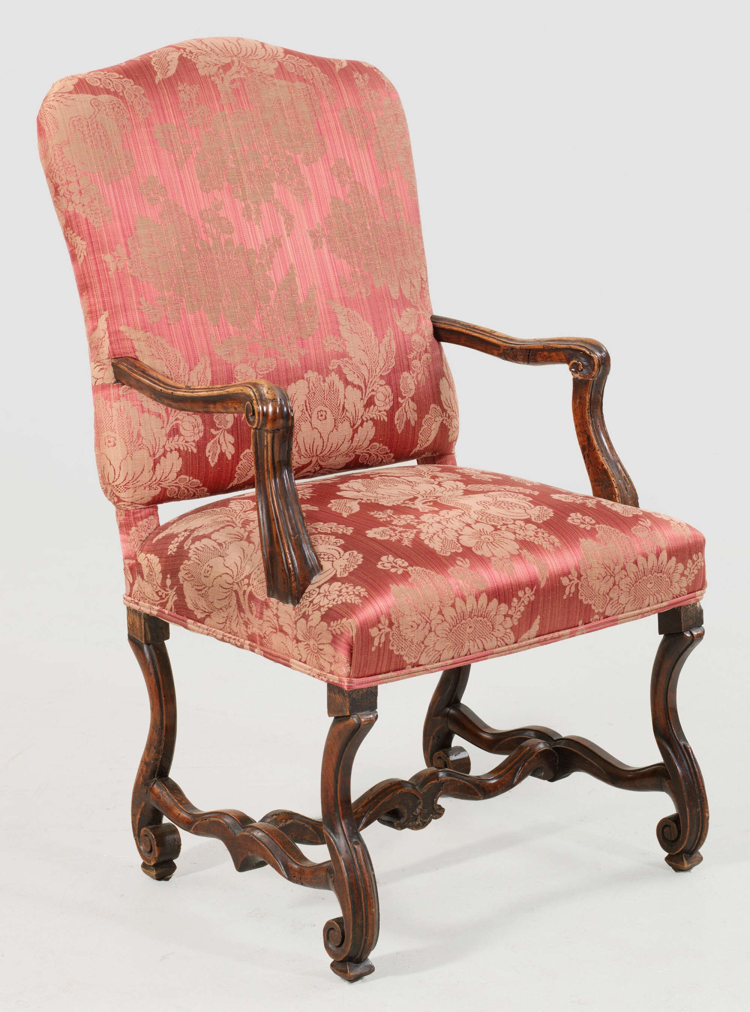 Barock-Armlehnsessel Nussbaum. Gerade, rechteckige Zarge auf volutenförmig geschwungenen Beinen, durch passig geschweifte Stege verbunden. Entsprechende Stützen für schmale Armlehnen sowie hohe, schildförmige Rückenlehnenrahmung. Gepolstert und bezogen. H. 112 cm. 64 cm x 61 cm. Sitz-H. 54 cm.
