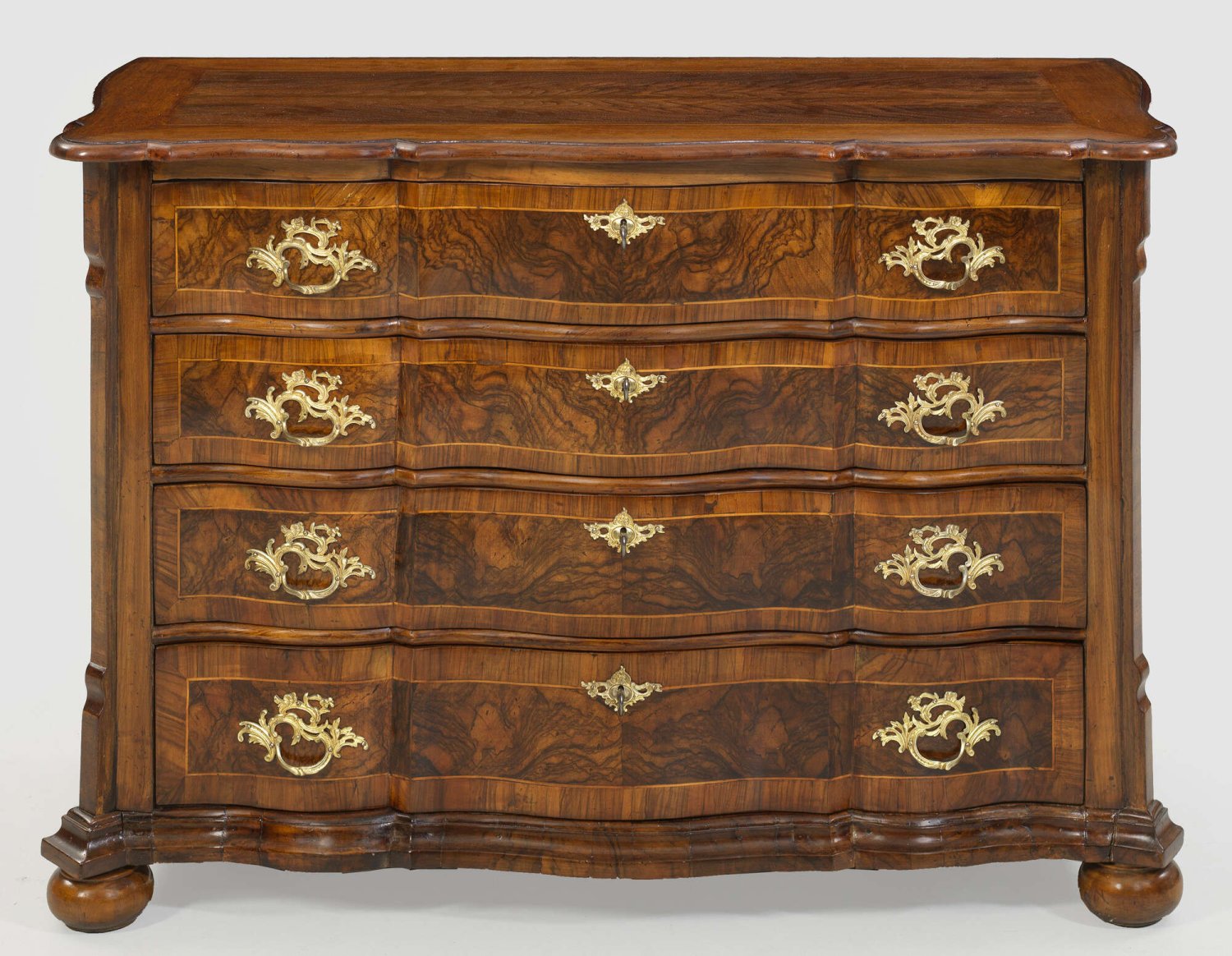 Barock-Kommode Nussbaum, furniert. Gerader, querrechteckig angelegter Korpus, flankiert von schmalen, schräggestellten Ecklisenen auf gekehlter Profilzarge und gedrückten Kugelfüßen. In der gegliederten Front vier breite, gegenläufig geschweifte Schubladen. Passig geschweifte Deckplatte. Flächendeckend breit gerahmte Furnierfelder. Rest. mit Erg.; H. 77 cm. 110,5 cm x 50 cm.
