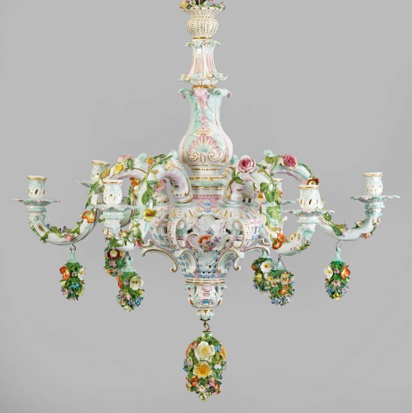 Porzellan-Deckenleuchter mit Blumendekor 6-flg.; Balusterförmiger, von Rocaillen und Akanthusblättern reich ornamentierter und mehrfach gegliederter Korpus. Unterhalb gitterartig durchbrochen gearbeitet mit farbenprächtigen Blumenbuketts in reliefierten Blattreserven. Sechs geschweifte Leuchterarme mit hängenden Blumenbuketts und aufgelegten Blütenranken, in vasenförmiger Tülle über Blattkranz endend. Polychrome Malerei mit Goldstaffage. Minim. best.; Schaft-H. 56 cm.