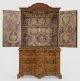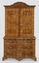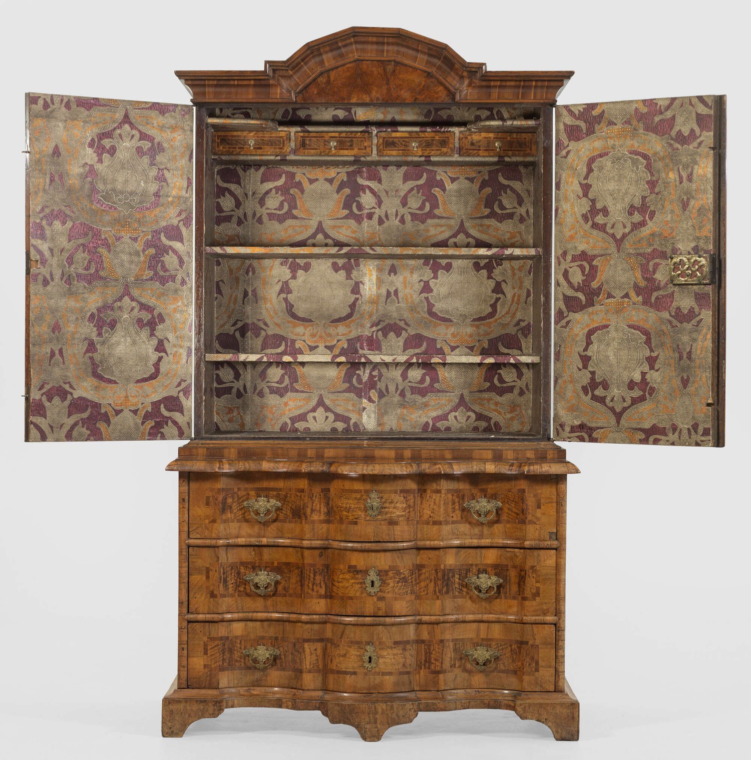 Große Barock-Aufsatzkommode Nussbaum und Nussbaummaser, furniert sowie Einlagen aus Pflaumenholz. Gerader Korpus auf gekehlter Profilzarge sowie gesägten Füßen. In der gegliederten Front drei breite, mehrfach gegenläufig geschweifte Schubladen. Korrespondierende, profilierte Deckplatte. Oberhalb zurückgesetzter, zweitüriger Aufsatz mit gekehltem, mittig aufgeworfenem Kranzgesims. Innen Ablageflächen und kleine Schubfächer sowie Tapetenauskleidung mit reichem Brokatmuster in Violett, Orange und Silber. Flächendeckend breit gerahmte Furnierfelder von teilw. mäanderförmig verkröpften Bandeinlagen begrenzt sowie in den Türen zentriert angeordnete Kartuschenmotive. H. 212 cm. 122 cm x 62 cm.