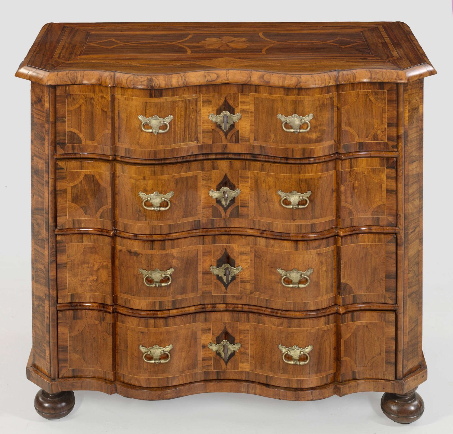 Barock-Kommode Nussbaum, teilw. auf Eichenholz, furniert. Gerader, rechteckiger Korpus, flankiert von schräggestellten Ecklisenen auf schmaler Profilzarge und Kugelfüßen. In der gegliederten Front vier mehrfach geschweifte Schubladen. Gering überstehende, profilierte Deckplatte. Flächendeckend breit gerahmte Furnierfelder, auf der Platte und den Seiten mit eingelegten stilisierten Blüten, von Bandeinlagen begrenzt. H. 94,5 cm. 103 cm x 94,5 cm.