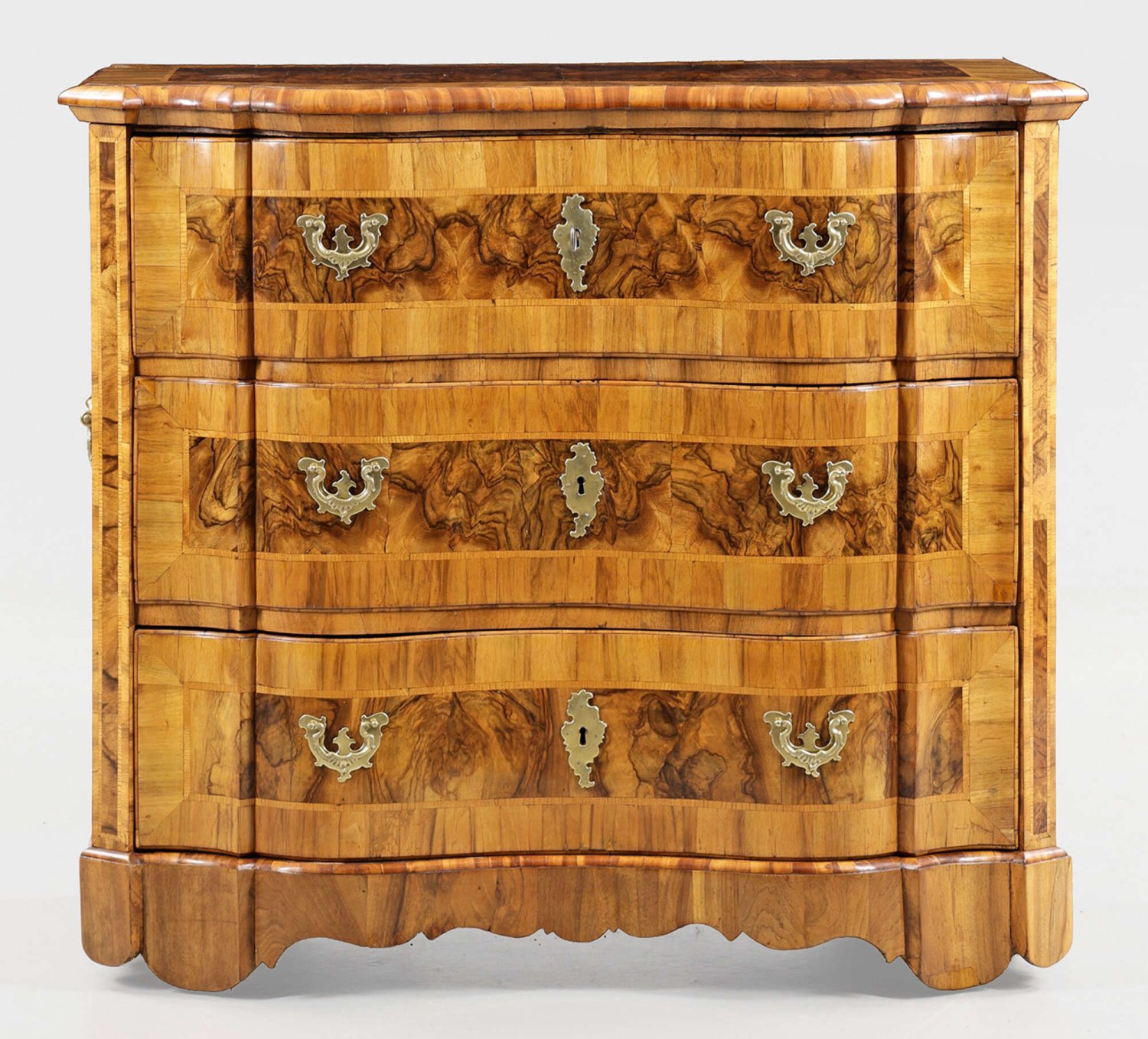 Große Barock-Kommode sog. Brandkommode. Nussbaum und Nussbaummaser, auf Eichenholz furniert. Gerader, rechteckiger Korpus mit seitlichen Griffen, flankiert von schmalen, schräggestellten Ecklisenen auf passig geschweiftem Sockel mit verdeckten Holzrollen. In der gegliederten Front drei breite, mehrfach geschweifte Schubladen. Dem Korpus entsprechende, gering überstehende Deckplatte. Flächendeckend breit gerahmte Furnierfelder, von Bandeinlagen aus Eschenholz begrenzt. H. 103 cm. 120 cm x 61 cm.
