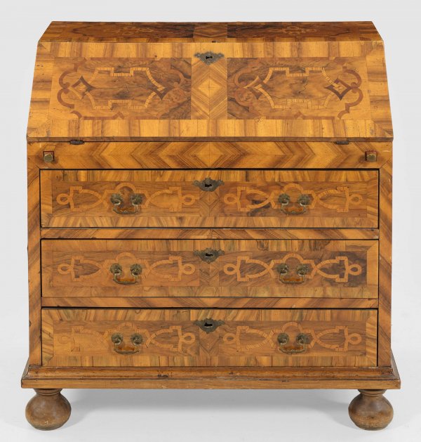 Barock-Schreibschatulle Nussbaum, furniert sowie Einlagen aus Eschen- und Pflaumenholz. Gerader, rechteckiger Korpus auf schmaler Zarge und gedrückten Füßen. In der gegliederten Front drei breite Schubladen sowie ausziehbare Stützen für schräggestellte, abklappbare Arbeitsfläche. Flächendeckend breit gerahmte Furnierfelder, teilw. von Bandeinlagen begrenzt. H. 98 cm. 97 cm x 52 cm.