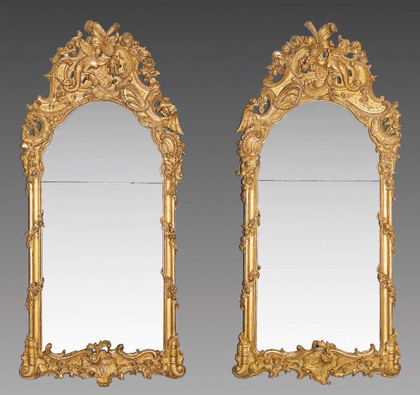 Paar große äußerst repräsentative George II-Wandspiegel Gegenstücke. Lindenholz, aufwändig geschnitzt, gefasst und vergoldet. Hochrechteckige, umlaufend profilierte, von Blütengirlanden umwundene, mehrfach passig geschweifte ansteigende Spiegelrahmung mit segmentförmigem Giebel. Breiter, reliefplastisch gestalteter unterer Abschluss aus üppigem Muschelnwerk, fein gearbeiteten Blättern und gegenläufigen Voluten. Hochgeschweifte, leicht vorkragende, durchbrochen gearbeitete und asymmetrisch angelegte Bekrönung aus dicht komponierten, gegeneinander gestellten C-Bögen und Gitterwerk. In der Mitte großer, reliefplastisch gestalteter Drachen, umgeben von reichen, erhaben reliefierten Rocaillen sowie naturalistisch gestalteten, detailreich gearbeiteten Blüten und Blattmotiven. Altes zweigeteiltes Spiegelglas. H. 192 cm x 90 cm.
