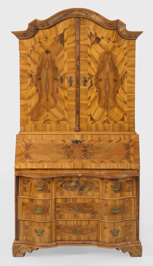 Großer Barock-Aufsatzsekretär Nussbaum, furniert sowie Einlagen aus Eschenholz. Gerader, rechteckiger Korpus auf schmaler Profilzarge sowie reliefierten Füßen. In der gegliederten Front drei mehrfach stark geschweifte Schubladen. Oberhalb schräggestellte, abklappbare Arbeitsfläche sowie zweitüriger Aufsatz mit geschweift ansteigendem Profilgiebel. Flächendeckend breit gerahmte Furnierfelder, teilw. von Bandeinlagen begrenzt. Rest. mit Erg.; H. 216 cm. 113 cm x 64 cm.