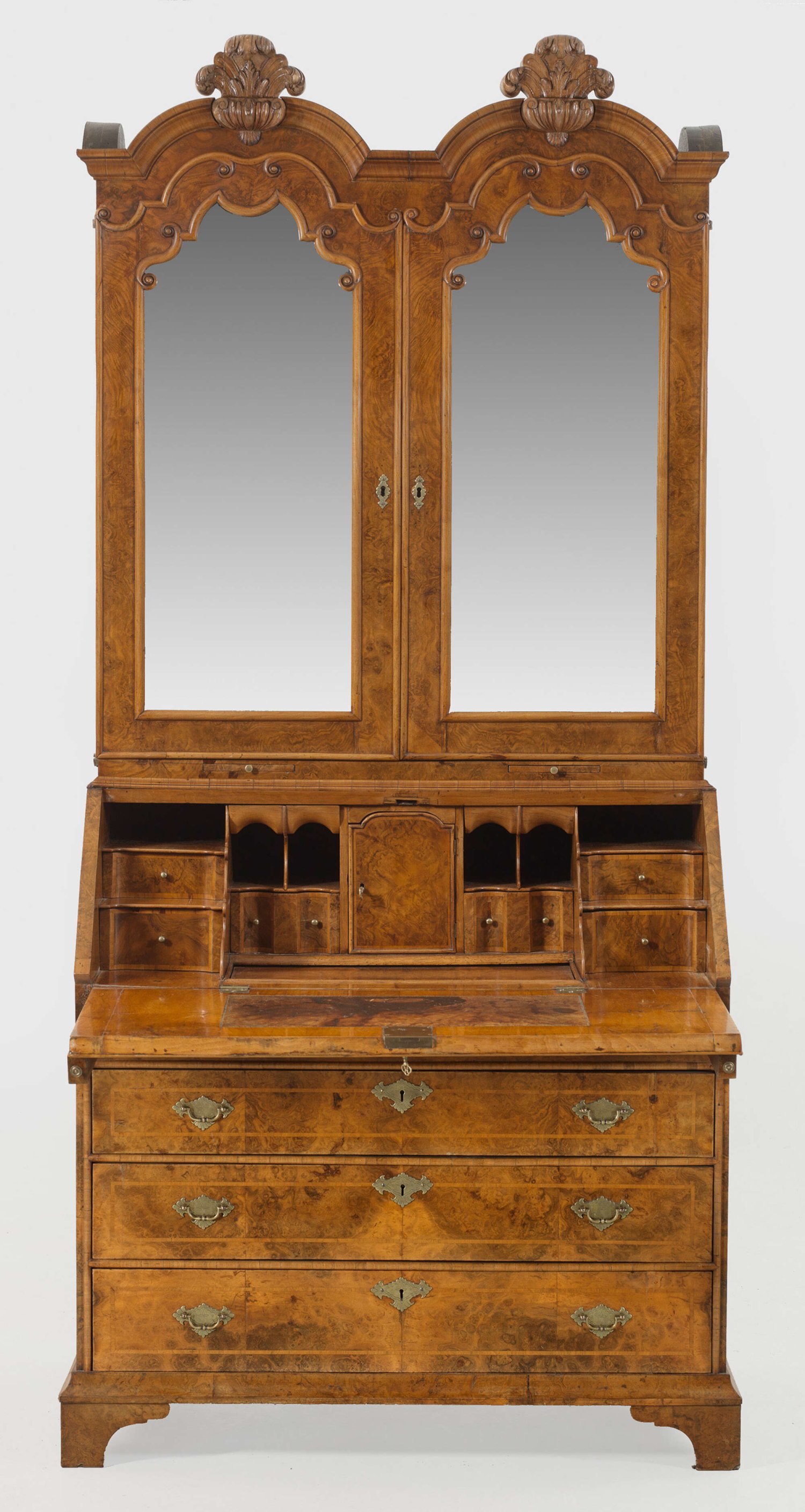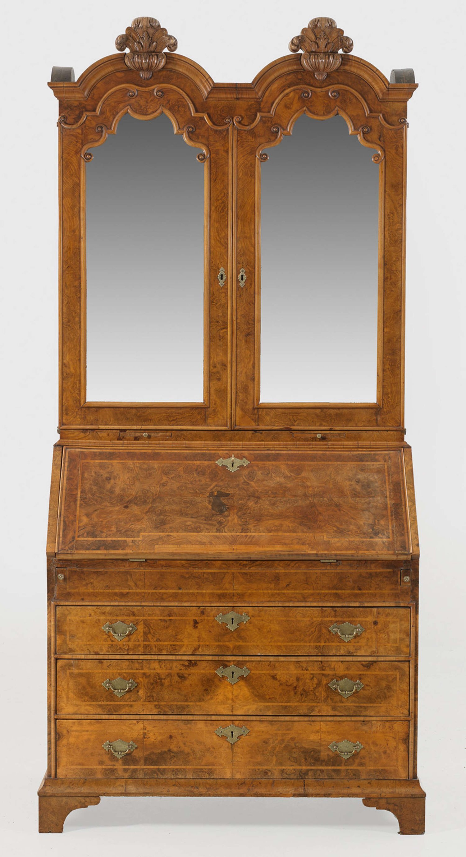 Großer Barock-Aufsatzsekretär Nussbaum und Wurzelnuss, auf Eichenholz furniert. Gerader, rechteckiger Korpus auf schmaler Kehlzarge und gesägten Füßen. In der gegliederten Front drei breite Schubladen sowie ausziehbare Stützen für schräggestellte, abklappbare Arbeitsfläche mit Ledereinlage. Dahinter gestaffelte Facheinteilung. Korrespondierender, zweitüriger Aufsatz mit profilgerahmten, facettierten Spiegelflächen, ausziehbare Abstellflächen für Kerzen sowie doppeltem, hochaufgeworfenem Segmentgiebel mit Bekrönungen aus großen Blattkartuschen. H. 232 cm. 110 cm x 63 cm.