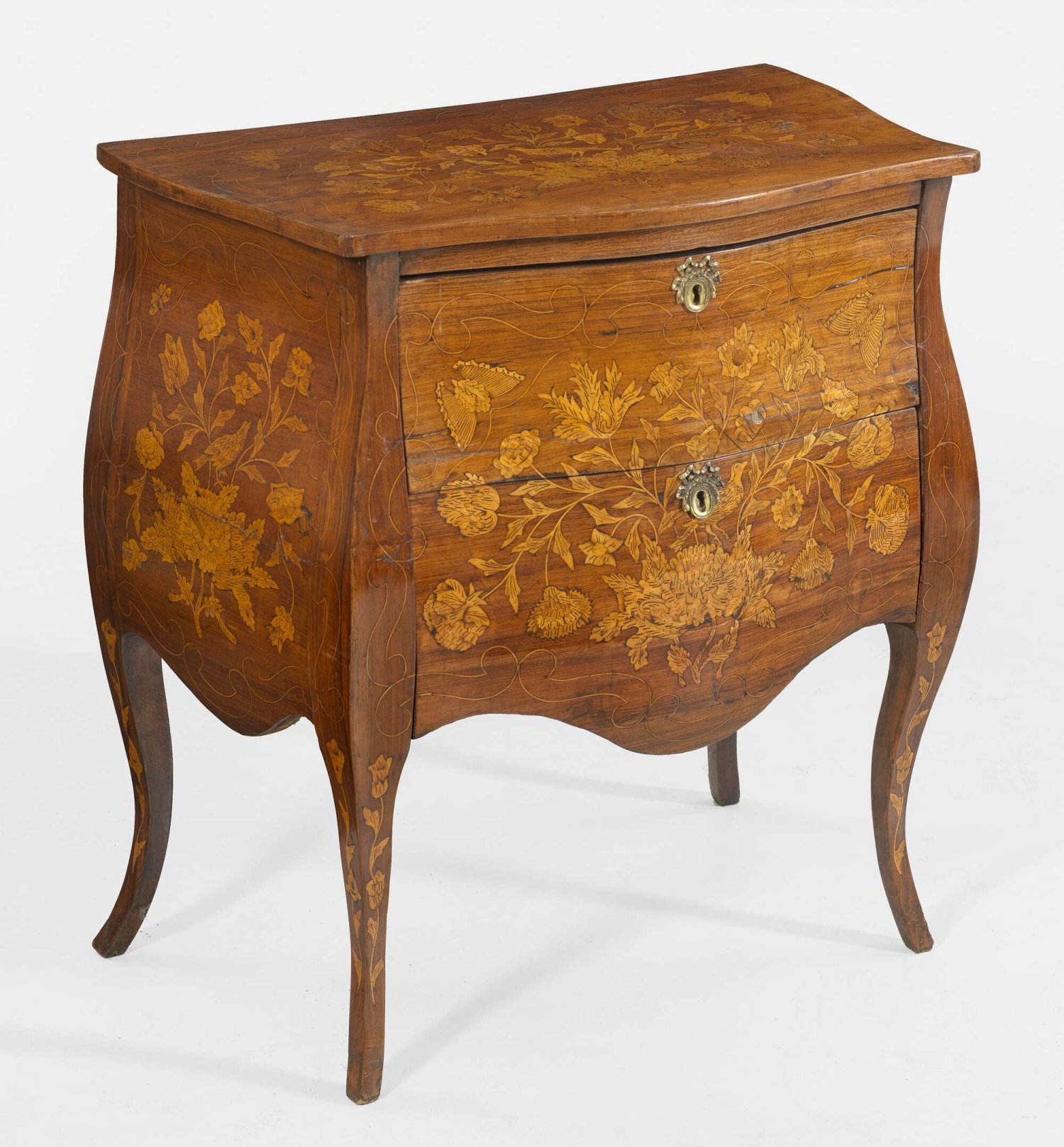 Kleine Louis XV-Kommode Palisander, furniert sowie reiche Marketerie aus Ahorn. Dreiseitig bombierter Korpus, flankiert von schmalen ausgebogten Ecklisenen. In der gegliederten Front zwei Schubladen sans traverse. Gering überstehende Deckplatte. Flächendeckende Marketerie aus unterschiedlichen Blüten, Vögeln und Schmetterlingen. H. 77 cm. 70 cm x 43 cm.