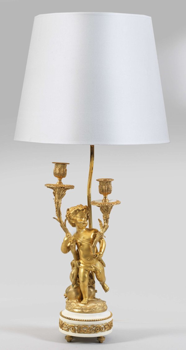 Große Louis XV-Tischlampe 1-flg.; Bronze, vergoldet sowie weißer Marmor. Über profiliertem Rundsockel mit breitem Fries aus Blattranken vollplastische Darstellung eines Puttenknaben, in seinen Armen gestreckte Füllhörner mit vasenförmigen Kerzentüllen emporhaltend. Dahinter schlanker Schaft als Träger für Leuchtmittel sowie konischen Lampenschirm. Nachträglich als Lampe montiert und elektrifiziert. H. 81 cm.