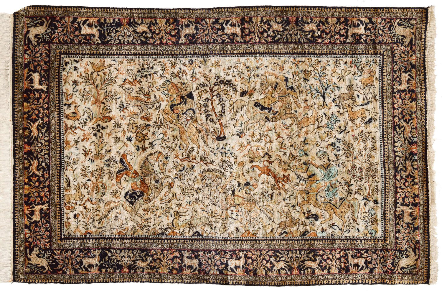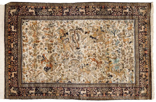 Ghom-Seidenbrücke Persien. Seide auf Seide. Feine Knüpfung. Im elfenbeinfarbenen Innenfeld flächendeckende Jagdszenerien aus berittenen Jägern und unterschiedlichen Wildtieren. Umlaufend tiefblaue Bordüre aus Blütenrispen und Wildtieren. 166 cm x 112 cm.