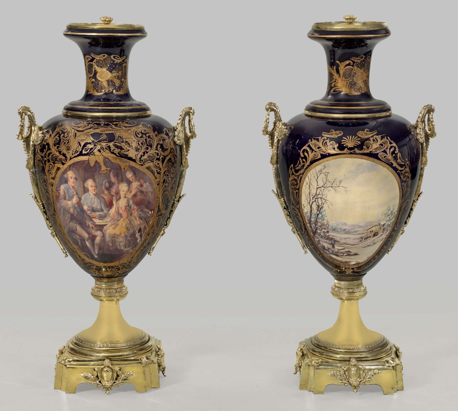 Paar monumentale Ziervasen mit vergoldeter Bronzemontierung. Rechteckiger, profilierter Sockel mit reliefplastischen Kartuschenapplikationen. Über hohem Rundfuß ovoider Korpus mit gerundeter Schulter, eingezogenem Hals und weit ausschwingendem Lippenrand. Seitlich plastisch aufsteigende Handhaben aus Akanthus- und Lorbeerblattwerk mit Ringgriffen. Beidseitig der Wandung, in kobaltblauem Fond, ausgesparte Reserven mit Darstellung einer höfischen Gesellschaft beim Kartenspiel bzw. bergiger Winterlandschaft als Umdruck. Erhabener Goldlackdekor aus üppigem Laub- und Bandelwerk mit Musikinstrumenten. Umlaufende Ornamentbordüre aus Eierstab. Rest.; H. 112 cm.