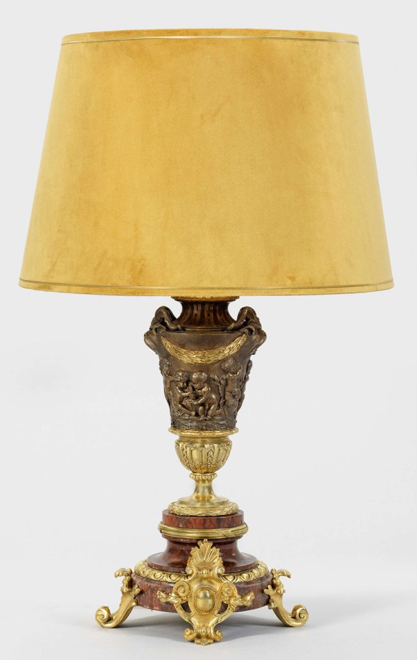 Große Napoleon III-Tischlampe 1-flg.; Bordeauxrot gemaserter Marmor sowie Bronze, vergoldet bzw. dunkel patiniert. Über gestuft ansteigendem, profiliertem Rundsockel auf Voluten- bzw. Balusterfüßen vasenförmiger Korpus mit reliefplastischen Groteskmaskarons und Lorbeerfestons. Umlaufend der Wandung erhaben reliefierter Fries aus Bacchantenkindern. Leicht konischer Lampenschirm. Neuzeitlich als Lampe montiert und elektrifiziert. H. 73 cm.