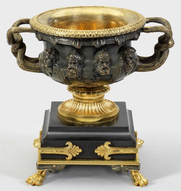 Empire-Tafelaufsatz Bronze, dunkel patiniert und teilw. vergoldet sowie schwarzer Marmor. Gedrückter, balusterförmiger Korpus mit erhaben reliefierten Maskarons und seitlichen Griffen aus verschlungenen Streben nach der berühmten "Warwick-Vase" aus der römischen Antike. Unterhalb profilierter Podestsockel, schauseitig mit Palmettenspangen auf Tatzenfüßen. H. 20 cm.