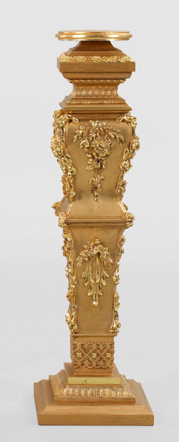 Postament im Louis XVI-Stil Holz, stuckiert und vergoldet. Über gestuft ansteigender Basis kräftiger, gekanteter mehrfach gegliederter Schaft mit üppigen, erhaben reliefierten Blütenmotiven und unterschiedlichen Profilbändern. Runde Deckplatte. Rest.; H. 131,5 cm.