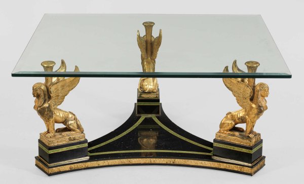 Couchtisch im Empire-Stil Holz, geschnitzt, gefasst und vergoldet sowie ebonisiertes bzw. grün gefärbtes Furnier und farbloses Glas. Dreiseitig konkav eingezogene Sockelplatte mit umlaufendem Palmettenfries. Oberhalb gekantete Podestsockel als Träger für vollplastisch gestaltete Sphingen unter quadratischer, facettierter Deckplatte. H. 48 cm. 110 cm x 110 cm.