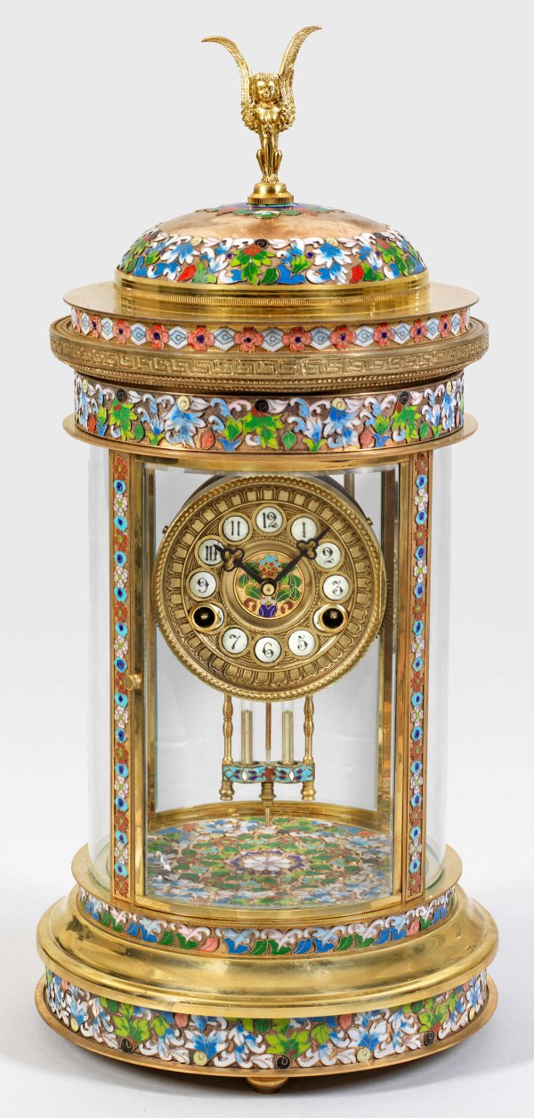 Pendule mit farbigem Cloisonné-Dekor Messing und Bronze sowie mehrfarbiger Cloisonné-Dekor in Form von Blattwerk. Bombierter, allseitig verglaster Korpus in Form eines Pavillons mit umlaufendem Gesims und flachem Kuppeldach auf profiliertem Rundsockel. Rundes Zifferblatt mit Emailreserven. Werk mit Schlüsselaufzug, Quecksilberpendel sowie Halbstundenschlag auf Tonfeder. H. 54 cm.