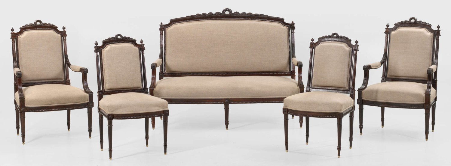 Louis XVI-Ameublement 5-tlg.; Sofa, Paar Armlehnstühle und Paar Stühle. Riopalisander, massiv und reliefplastisch geschnitzt. Gerade Zarge mit schmalem Palmettenfries auf schlanken, kannelierten Balusterbeinen. Gebogte Stützen für schmale, geschweift ansteigende Armlehnen. Rechteckige Rückenlehnenrahmung mit gewölbtem oberen Abschluss sowie reliefplastischer Kranzbekrönung, flankiert von kannelierten Säulen. Gepolstert und bezogen. Sofa-H. 114 cm. 150 cm x 67 cm. Sitz-H. 43 cm.