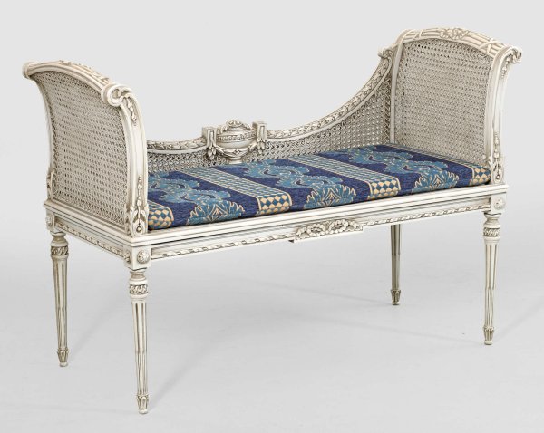 Kleine Bank im Louis XVI-Stil Holz, reliefiert und hellgrau gefasst. Gerade, profilierte Zarge auf schlanken, kannelierten Balusterbeinen. Leicht ausschwingende Armlehnen sowie niedriger hinterer Abschluss mit Vasenmotiv. Bespannung aus Rohrgeflecht sowie lose Polsterauflage. H. 83 cm. 121 cm x 51 cm. Sitz-H. 45 cm.