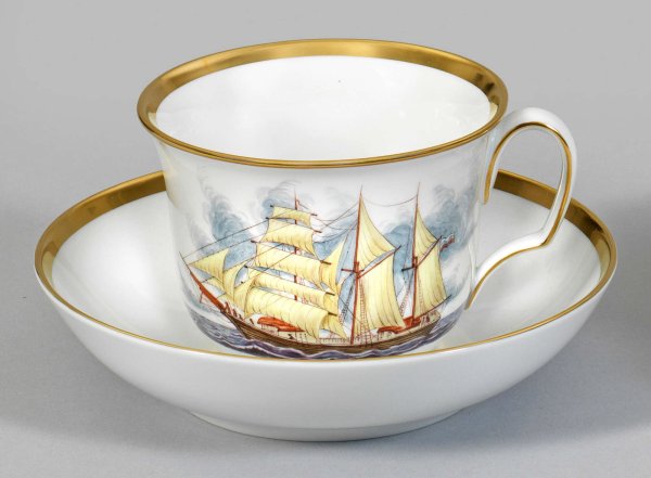 mit Untertasse. Schauseitige Darstellung der 1874 in Sideby erbauten Schonerbark Fennia in feiner, polychromer Malerei. Goldrand. Limitierte Auflage 117/300. Originalkarton. Schwertermarke. H. 8 cm.