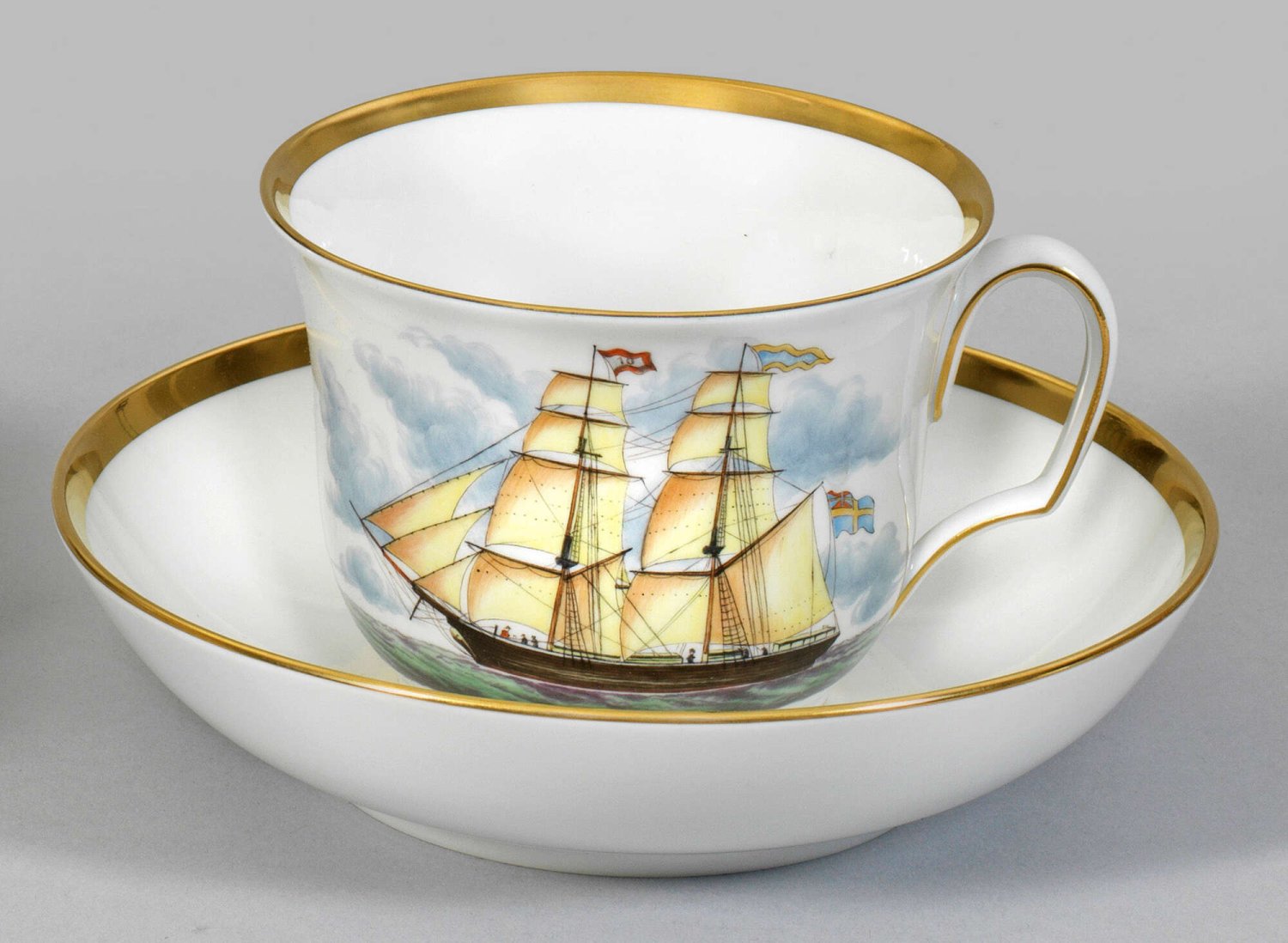 mit Untertasse. Schauseitige Darstellung der 1846 in Gefle erbauten Brigg ALFHILD von 299 RT in feiner polychromer Malerei. Goldrand. Limitierte Auflage 58/300. Originalkarton. Schwertermarke. H. 8 cm.