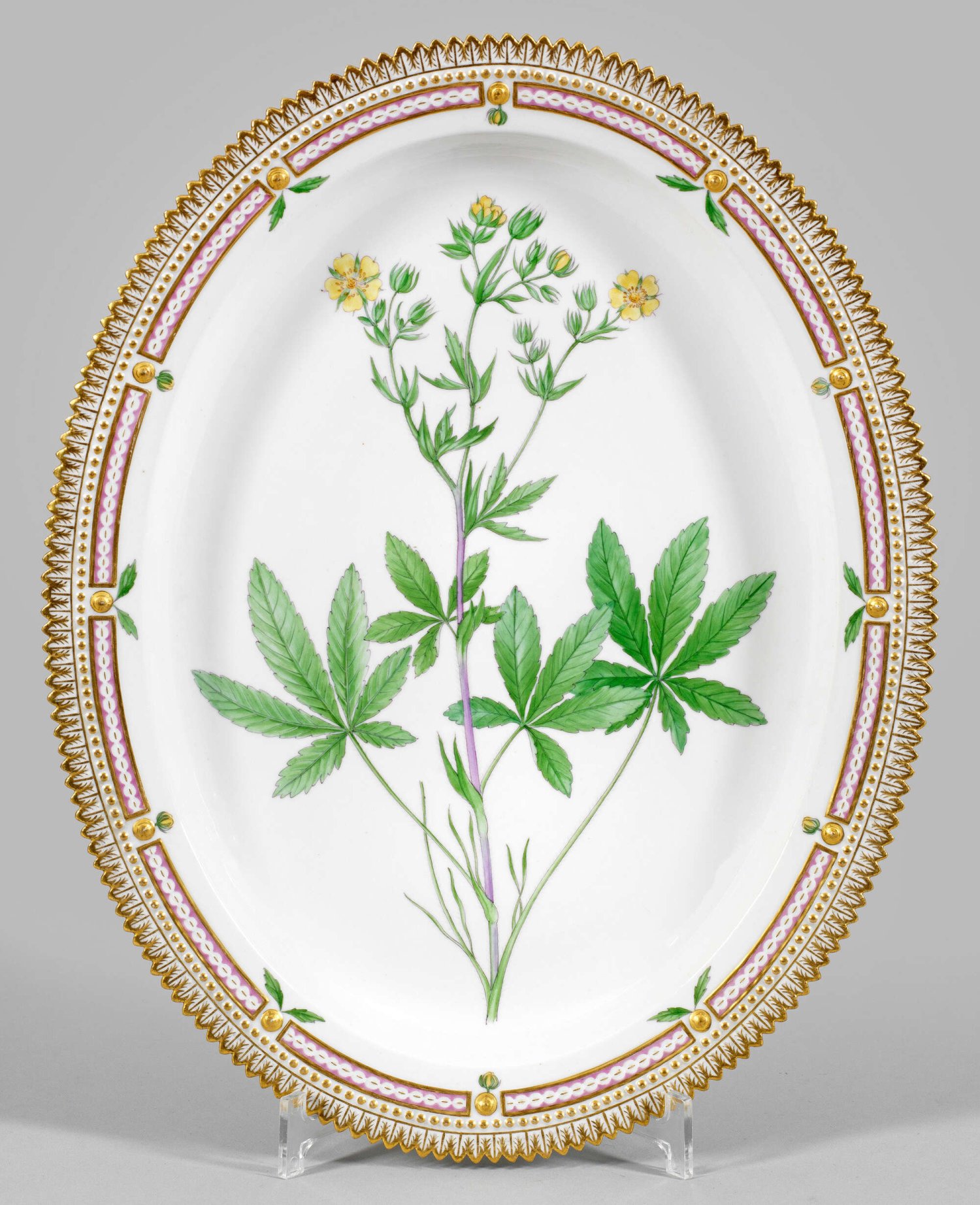 Große "Flora Danica"-Anbietplatte Ovale Form. Umlaufend gezackter, goldstaffierter Blattrand mit rosafarbener Bordüre. Im vertieften Spiegel blühendes, sog. Hohes Fingerkraut (Potentilla recta) in feiner polychromer Malerei. Verso lateinisch bez.; Manufakturmarke. 41 cm x 32 cm.