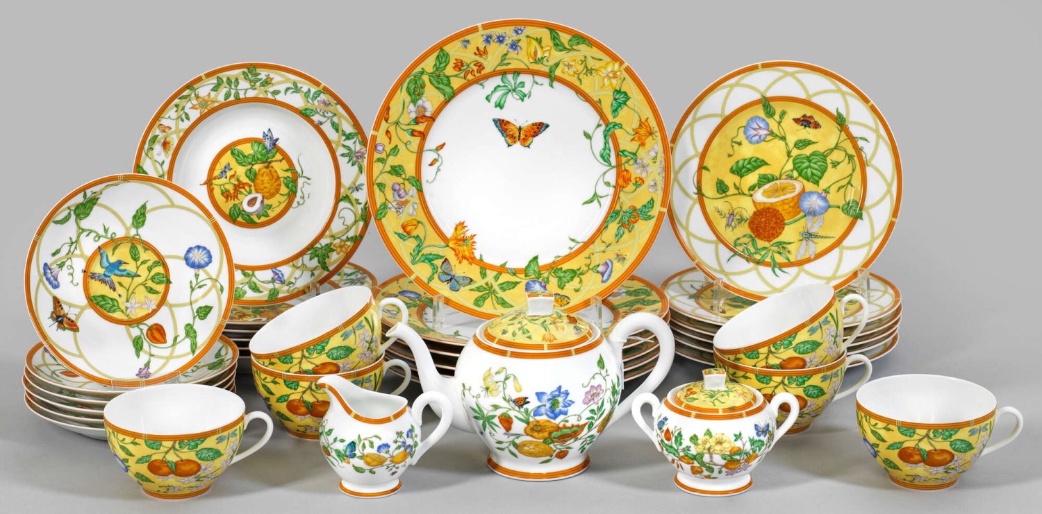 Tee-und Speiserestservice "La siesta Hermés" von HERMÉS 27-tlg.; Teekanne, Zuckerdose, Sahnegießer, 6 Teetassen mit Untertassen, 6 Gourmet-, 6 Suppen-, 6 Kuchenteller. Auf der Wandung und im Spiegel farbenprächtiger Dekor aus verschiedenen Früchten, Rankenwerk mit großen Blüten sowie Schmetterlingen und Insekten auf weißem bzw. sommergelbem Fond, sog. "La siesta Hermès". Fahne mit Bogenmotiven sowie umlaufende orangefarbene Randbordüre. Minim. best.; Leichte Gebrauchsspuren. Firmenmarke. Gourmetteller-D. 27,5 cm. Kannen-H. 15 cm.