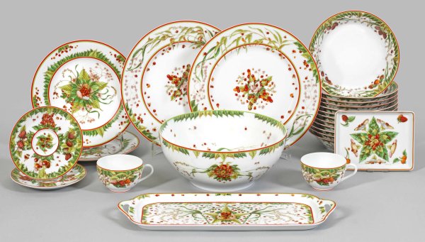 Restservice "Le jardin de Pythagore" von HERMÈS 21-tlg.; 2 Gourmet-, 12 Salat-, 2 Kuchenteller, Salatschale, 2 Teetassen mit Untertassen, Kuchenplatte, kleines Tablett. Auf der Wandung und im Spiegel farbenprächtiger Dekor aus Erdbeeren, Kirschen, Hagebutten und Weißdorn, sog. "Le jardin de Pythagore" (" Der Garten des Pythagoras") . Firmenmarke. Gourmetteller-D. 27,5 cm. Kuchenplatte 39 cm x 15 cm.