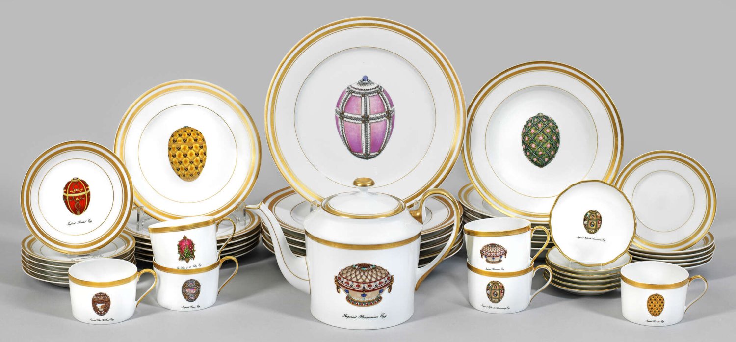 Kaffee- und Speiserestservice von FABERGÉ 37-tlg.; Kaffeekanne, 6 Tassen mit Untertassen, 6 Kuchen-, 6 Gourmet-, 6 Suppen-, 6 Brot-, 6 Canapés-Teller. Mit Motiven von sieben verschiedenen, berühmten Kaiserlichen Fabergé-Ostereiern. Auf der Wandung bzw. im Spiegel farbenprächtige Darstellung des "Renaissance Egg" (Renaissance-Ei), "Rosebud Egg" (Rosenknospen-Ei), "Peter the Great Egg" (Ei Peter der Große), "Coronation Egg" (Krönungs-Ei), "Cameo Egg" (Ei der Katharina der Großen) , "Rose Trellis" (Rosen-Spalier-Ei, "The Lilies of the Valley Egg" (Maiglöckchen-Ei), "Fiftteenth Anniversary Egg" (Ei zum 15. Jubiläum), "Danish Palace Egg" (Dänisches Palast-Ei). Umlaufene Reliefgoldborüre sowie reiche Goldstaffage in 24 Karat. Firmen- bzw. Manufakturmarke. Kannen-H. 17 cm. Gourmetteller-D. 27,5 cm.