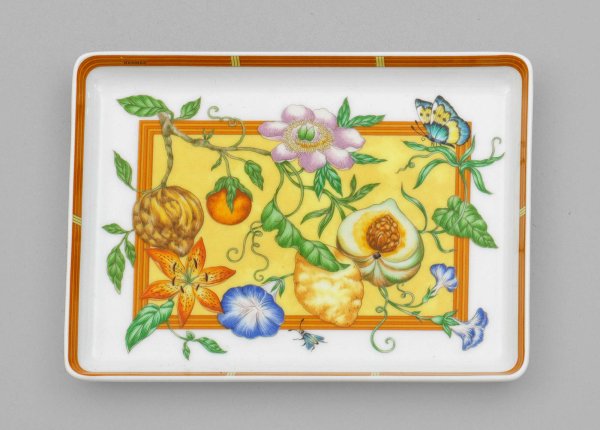 Kleines Tablett "La siesta Hermès" von HERMÈS im Originaletui. Rechteckige, leicht gemuldete Form. Im Spiegel farbenprächtiger Dekor aus Blumen, Früchten sowie Insekten und Schmetterlingen. Firmenmarke. 16 cm x 12 cm.