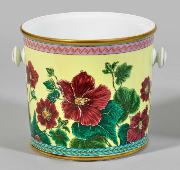 Cachepot mit Dekor "Tropical Wonderland" aus der Kollektion "Rosenthal meets Versace". Runder, leicht konisch ansteigender Korpus, seitliche Knopfgriffe. Farbenfroher Dekor aus großen bordeauxroten Blüten auf leuchtenden, zitronengelben Fond. Umlaufende Ornamentbordüren. Goldrand. Entw. Gianni Versace. Manufakturmarke. H. 19,5 cm. Mündungs-D. 21,5 cm.