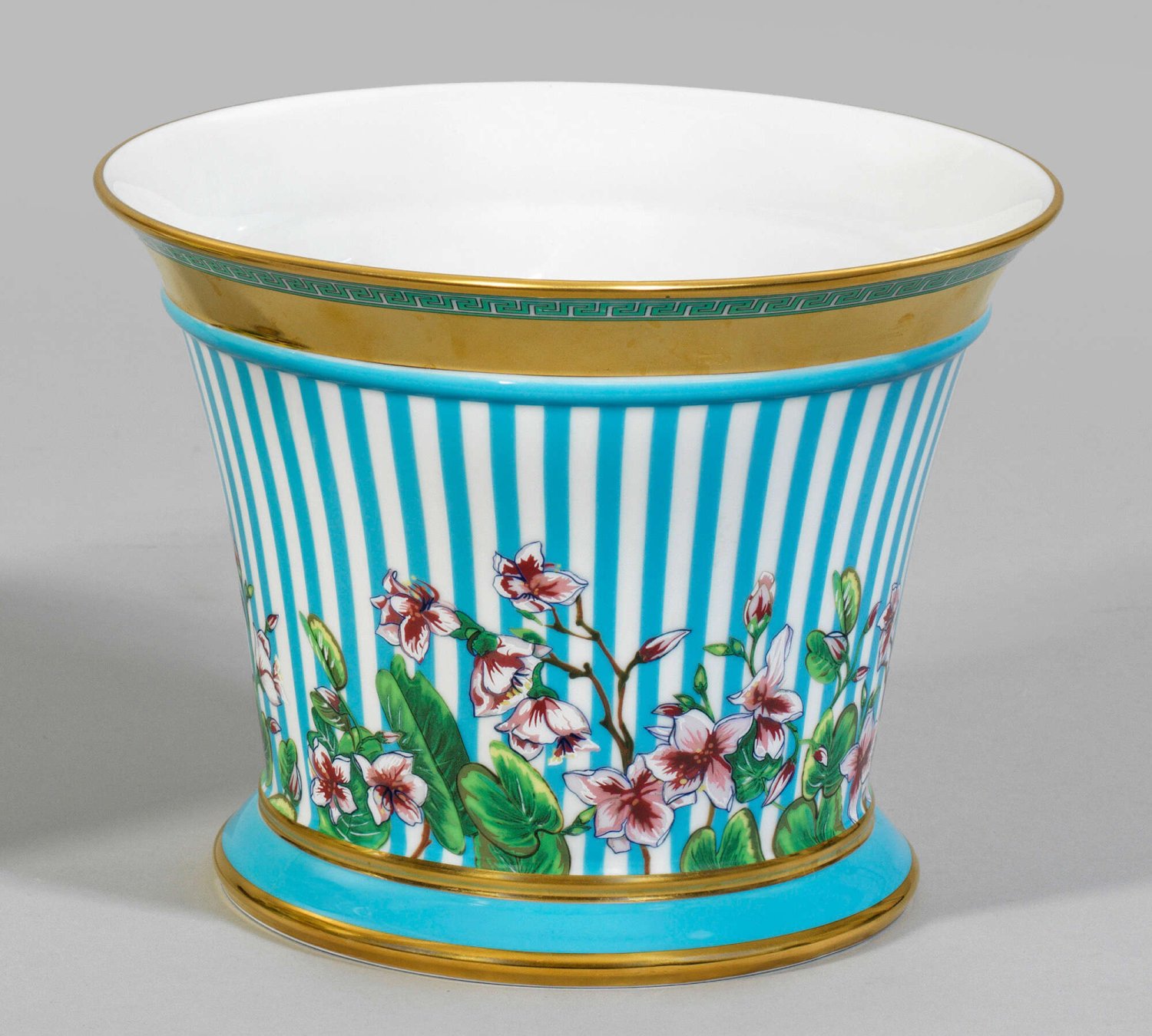 Cachepot mit Dekor "Wild flora" aus der Kollektion "Rosenthal meets Versace". Über profiliertem, rundem Stand sich konisch erweiternder Korpus mit weit ausschwingendem Rand. Flächendeckendes Streifenmuster mit Kirschblütenzweigen. Umlaufende Randbordüre mit Mäander. Reiche Goldstaffage. Entw. Gianni Versace. Manufakturmarke. H. 19,5 cm. Mündungs-D. 25,5 cm.