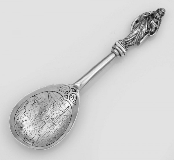 Apostellöffel Silber. Ovale, gemuldete Laffe mit mehrfiguriger Kreuzigungsdarstellung. Griff mit auf Sockel stehendem Apostel mit Buch. Gest. Gew. ca. 95 g. L. 19 cm.