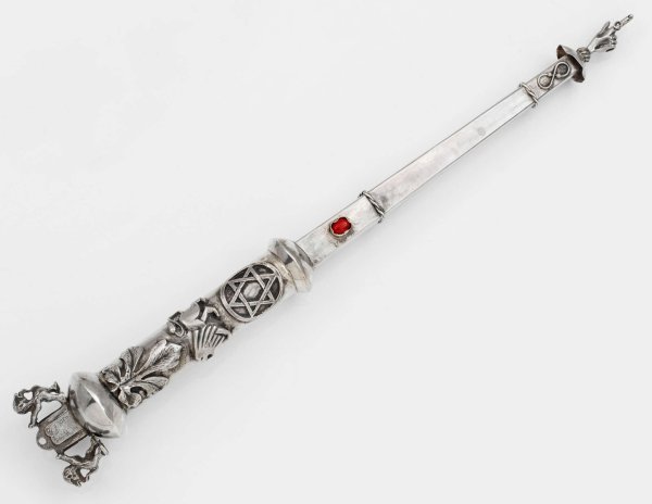 Torazeiger Silber. Gekanteter, in eine Hand übergehender Schaft, besetzt mit einem Karneol. Auf zylindrischem Griff reliefplastisch aufgelegter Davidstern, Löwe und Blattornament. Heft in Form einer Gesetzestafel, flankiert von Löwen als Schildträger. Gest., Pseudomarken. Gew. ca. 55 g. L. 29 cm.