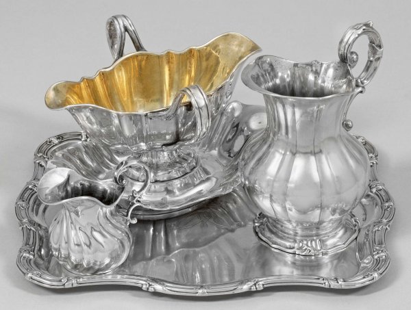 Vier Tafelaccessoires Silber. Milchkännchen, Sahnegießer, Tablett mit graviertem Monogramm und Grafenkrone sowie innen vergoldete Sauciere. Unw. Gebrauchsspuren. Gest., teilw. 13 Lot, 800, Stadtmarke, Meister Johann Daniel Christian Schleissner (wird Bürger 1824) bzw. Herstellerzeichen. Gew. zus. ca. 1300 g.