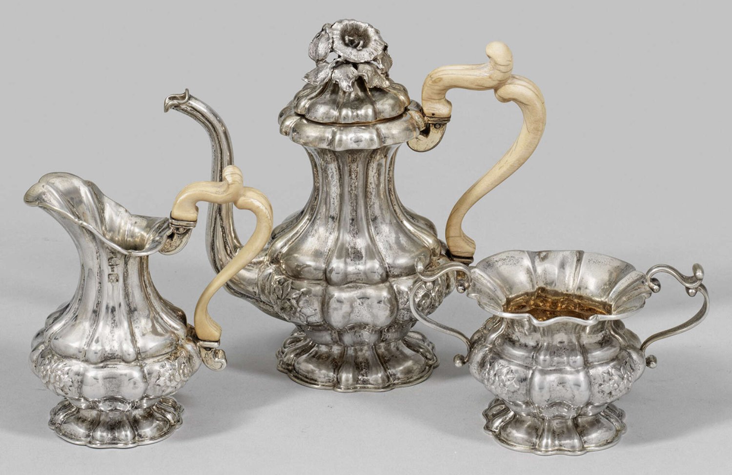 Biedermeier-Mokkaservice Silber. 3-tlg.; Mokkakanne, Sahnegießer und Zuckerschale. Gebauchter, stark godronierter Korpus mit schlankem Hals. Unterer Wandungsrand akzentuiert von reliefierten Blüten. Tief angesetzte Tülle, großer Blütenknauf. Volutenhenkel aus Holz. Restvergoldung. Gest., Stadtmarke, Herstellerzeichen. Gew. zus. ca. 615 g. H. 7,5 cm - 16,5 cm.