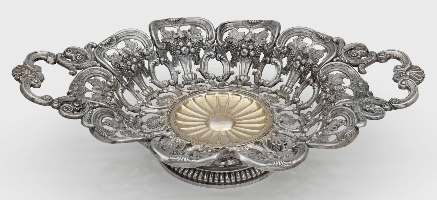 Spätbiedermeier-Gebäckschale Silber, teilvergoldet. Über flachem Stand leicht gemuldeter Korpus mit zentraler Rosette. Reliefplastische Wandung umlaufend durchbrochen gearbeitet in Form gegenständiger Voluten und gefüllter Fruchtkörbe. Volutenhenkel. Gest. 12 Lot, Meister Ernst Friedrich Kemnis (wird Meister 1828). Gew. ca. 370 g. H. 8,5 cm. 37,5 cm x 26,5 cm.