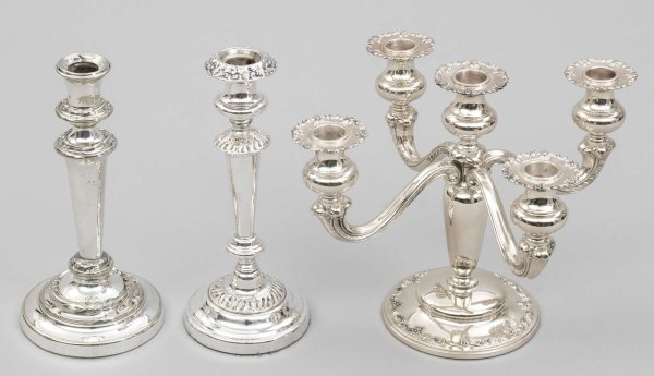 A German five-light weighted girandole. In addition two plated candlesticks. Standard mark 925, maker´s mark.