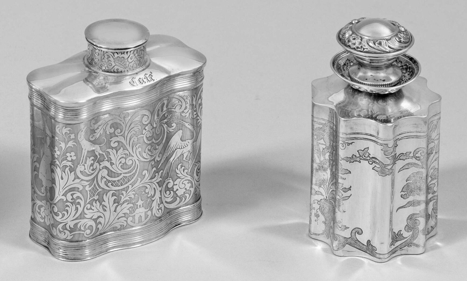 Tee- und Kaffeedose Silber. Runder bzw. rechteckig geschweifter Korpus mit Rokokodekor, teilw. bez. Café. Stulpdeckel. Gest. 13 Lot, teilw. Meistermarke Conrad Eduard Mappes (wird Meister 1837). Gew. zus. ca. 255 g. H. 11,5 cm - 12,5 cm.
