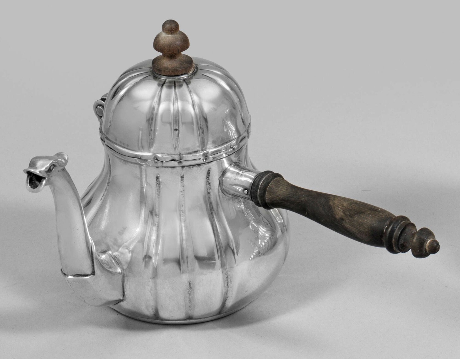 Teekanne Silber. Gebauchter Korpus mit halbrundem Deckel, umlaufend gegliedert durch schmale Züge. Tief angesetzte, gebogte Tülle, seitlich gedrechselter Holzgriff. Gest. 800, Herstellerzeichen. Gew. ca. 500 g. H. 15 cm.