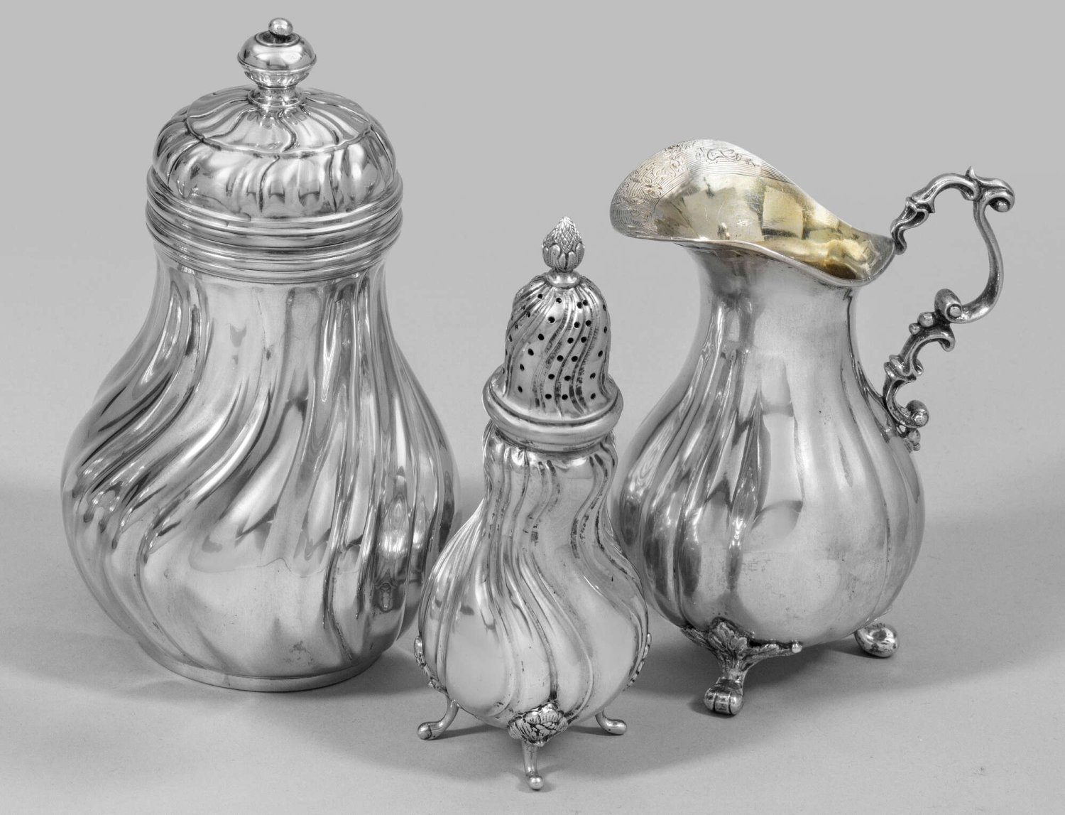 Sahnegießer, Zuckerdose und -streuer Silber. Gebauchter Korpus, umlaufend durch passige Züge gegliedert. Teilw. innen vergoldet sowie minim. besch.; Gest. 800 bzw. teilw. Stadtmarke, Jahresbuchstabe, wohl Meister Johan Ferdinand Bäckström (wird Meister 1849). Gew. zus. ca. 720 g. H. 13,5 cm - 17,5 cm.