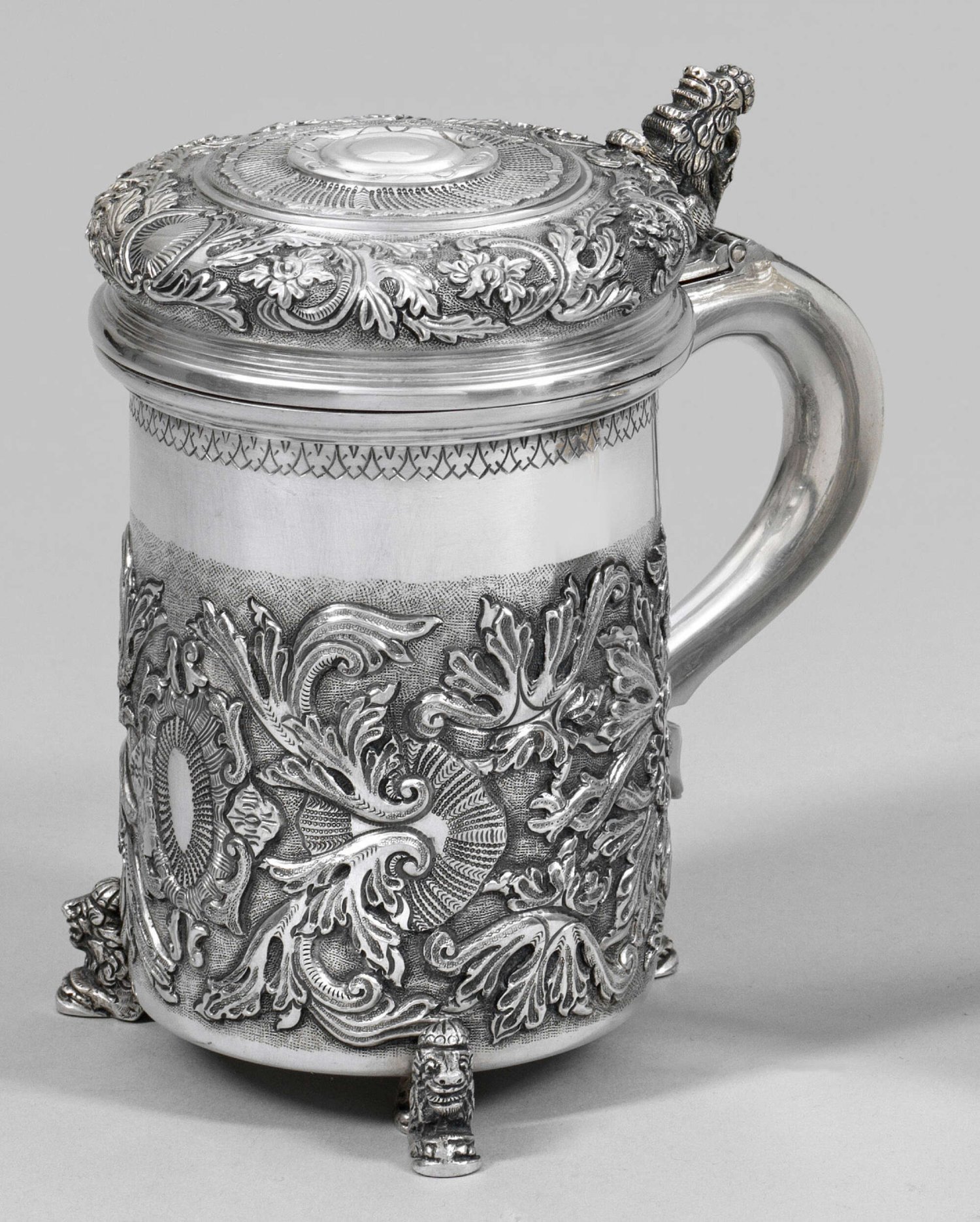 Humpen im Barockstil Silber. Von Löwenfüßen getragener, zylindrischer Korpus mit gewölbtem Deckel. Wandung und Deckel flächendeckend hochreliefplastisch gearbeitet in Form von Blattranken über schlangenhautähnlich punziertem Grund. Bandhenkel mit Drücker in Gestalt eines bekrönten Löwen. Gest. 835. Gew. ca. 750 g. H. 16,5 cm.